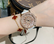 Product Details: Shape: round Movement type: Quartz movement Popular elements: Mosaic Color classification: Rose gold white skin, rose gold black skin, rose gold green skin, rose gold red skin, rose gold brown skin, rose gold green diamond green skin, rose gold pink diamond powder skin, rose gold colored diamond black skin Strap material: genuine leather Buckle style: pin buckle